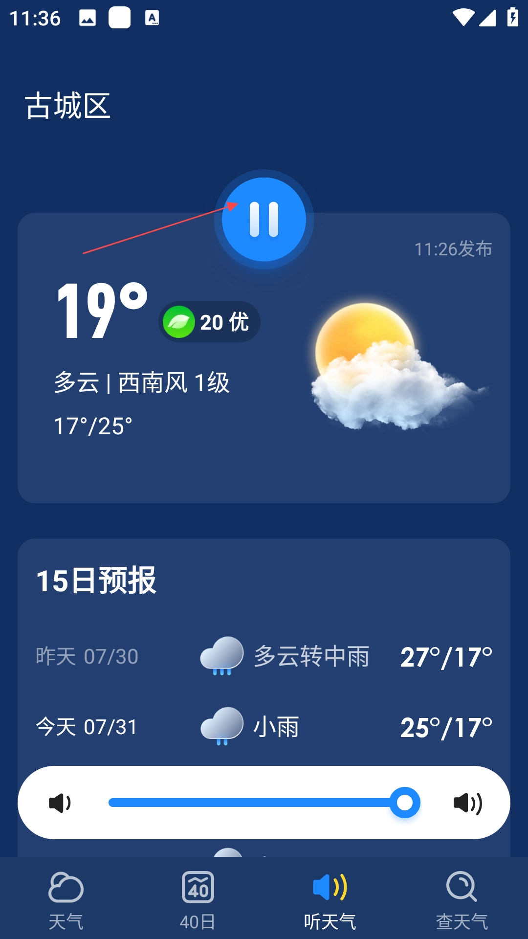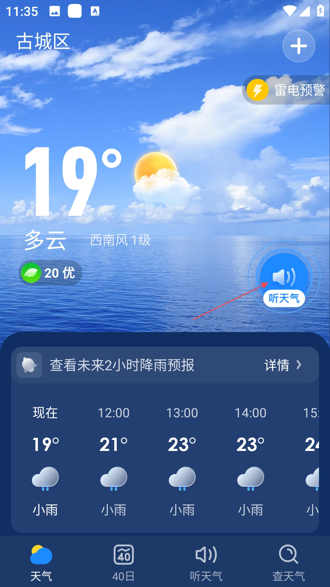 打开【天气】界面后,找到并点击“喇叭”形状的图标,即可进入【听天气】界面。