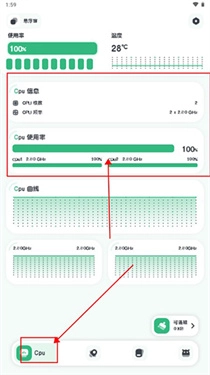 1、进入软件后我们就可以看到手机的使用情况,CPU信息和使用率;