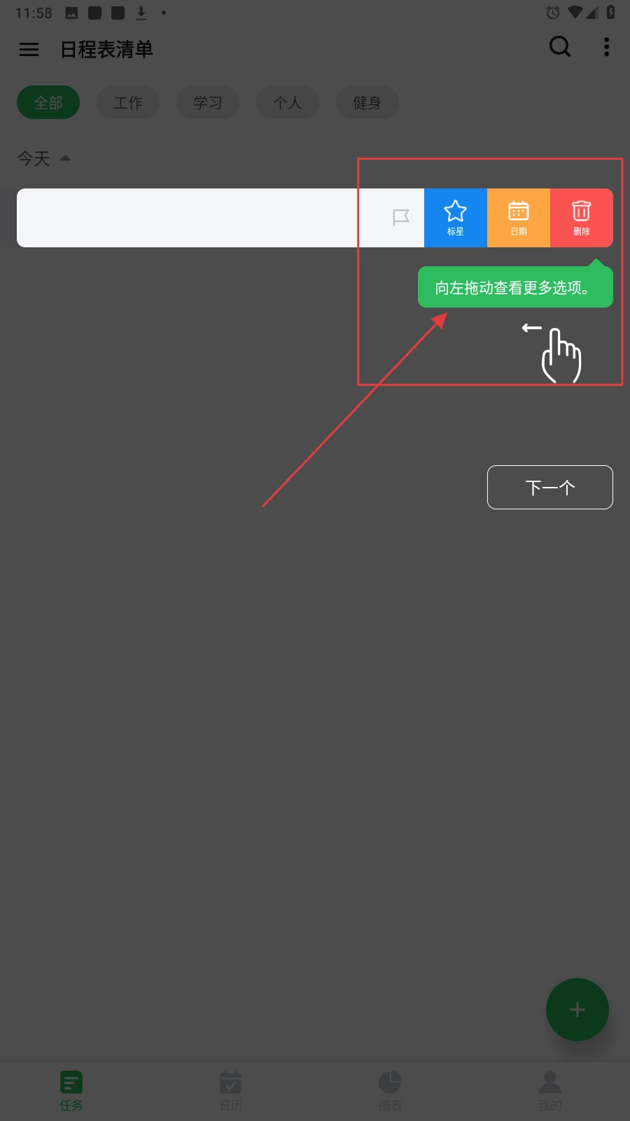 3、向左拖动已创建任务,可查看【标星】【日期】【删除】等更多操作选项。