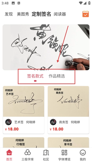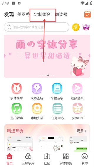 1、在的首页,点击顶部的【定制签名】标签,可进入签名定制页面,挑选各类签名样式啦。