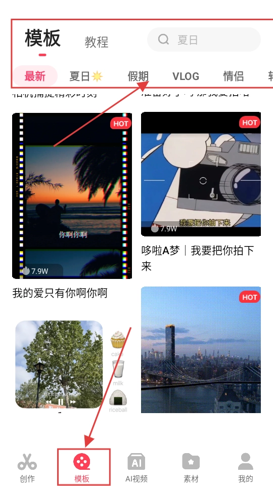 1、模板页面设有【最新】【夏日】等分类,海量模板可供挑选,底部的【模板】按钮十分醒目,点击该按钮即可浏览各类模板。