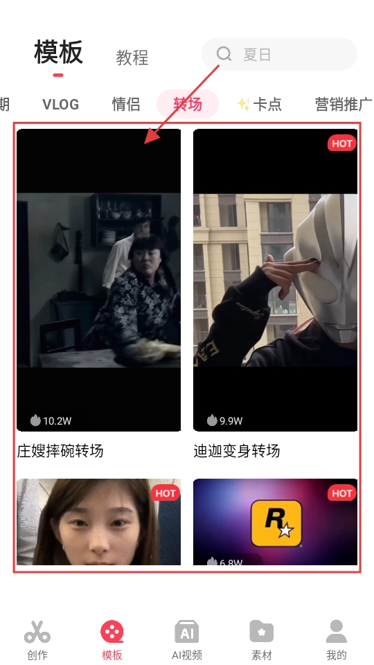 2、选择【转场】分类,里面包含庄嫂摔碗转场、迪迦变身转场等多种模板,您可以挑选自己喜欢的,点击进入就能查看详细信息啦。