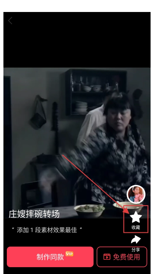 3、进入庄嫂摔碗转场模板的详情页面后,就能看到十分有趣的画面,如果想要收藏,点击【收藏】按钮即可,操作非常便捷。