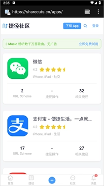 7、若不清楚URL Scheme对应的链接,可前往左上角的“捷径社区”进行查找;也能通过搜索引擎,输入App名称加上URL Scheme的组合来尝试搜索获取。
