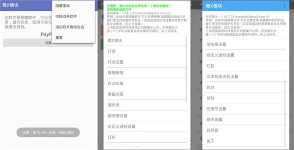 《微X模块支持微信版本》中了能在微信使用的功能,可以让微信的用户使用更多自动工具,为用户提供多种功能供您探索,提供包括自动红包抓取功能,了可定制的微信通知系统工具,自定义短视频的录制时间,这个软件还支持自动踢人的功能,您可以与朋友聊天和交流,可以防止微信聊天消息被召回,它还具有视频图像的一键转发功能,非常方便,所有功能均可供用户使用,在几秒钟内回复更多好友信息。
