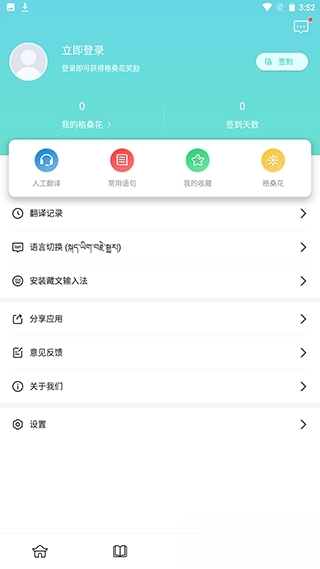5、在最后一栏中,可查看翻译记录、切换语言、安装藏文输入法以及请求人工翻译等功能。