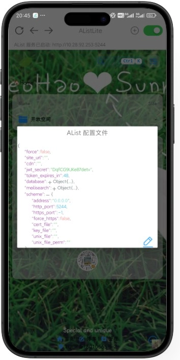 10、Advanced为了最大程度契合AList本身的功能特性,AListLite允许用户手动调整AList的配置文件。用户只需点击软件右上角的+号,然后选择“高级配置”选项来修改配置文件,就能满足自定义端口、HTTPS设置、数据库配置等个性化需求。