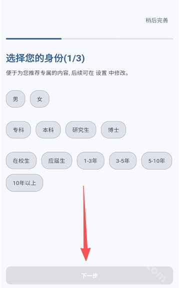 3、选择你的性别、学历和工作年龄,点击下一步