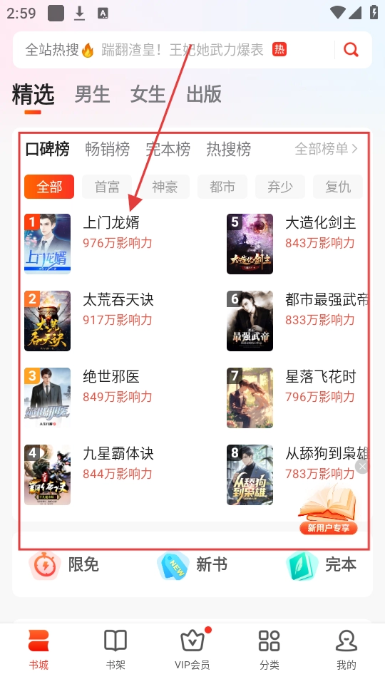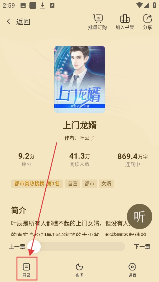 打开应用后,在书城页面挑选自己喜欢的小说,像《上门龙婿》这类,接着点击就能进入该小说的详情页面了。