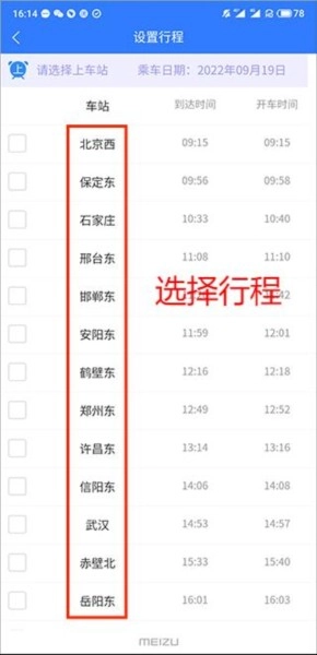 3、选择用户车次乘坐的行程。