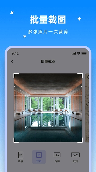 4、批量裁图:可对多张图片进行批量裁剪操作,既支持多种固定尺寸裁剪,也允许自由裁剪,仅需一步即可完成所有裁剪任务。