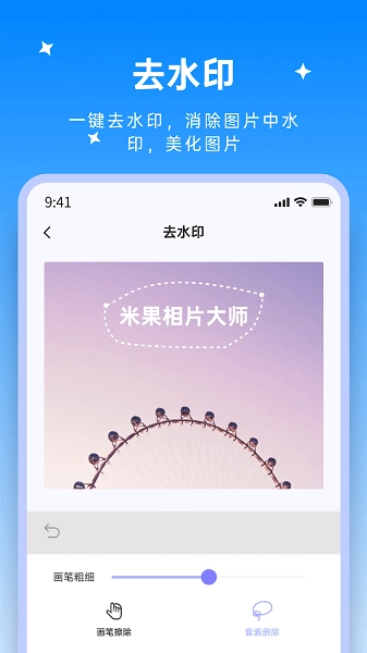 1、去水印:一键操作即可去除图片中的水印,让图片更加美观。