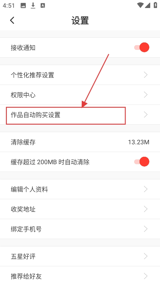 在设置页面中,找到【作品自动购买设置】这一选项,点击该选项即可对作品自动购买的相关内容进行设置。