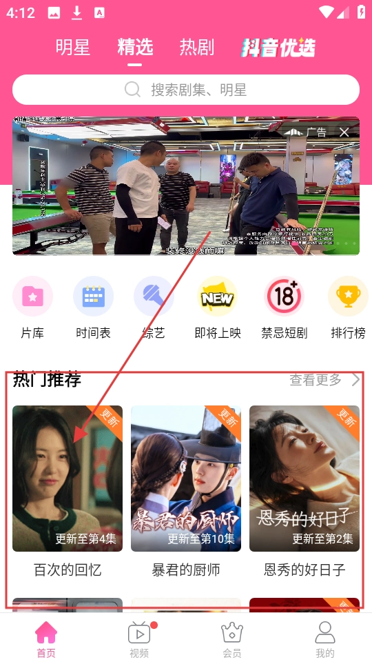 在应用首页,设有【明星】【精选】等分类板块,同时展示着热门推荐的剧集,让用户可以轻松找到自己想看的内容。