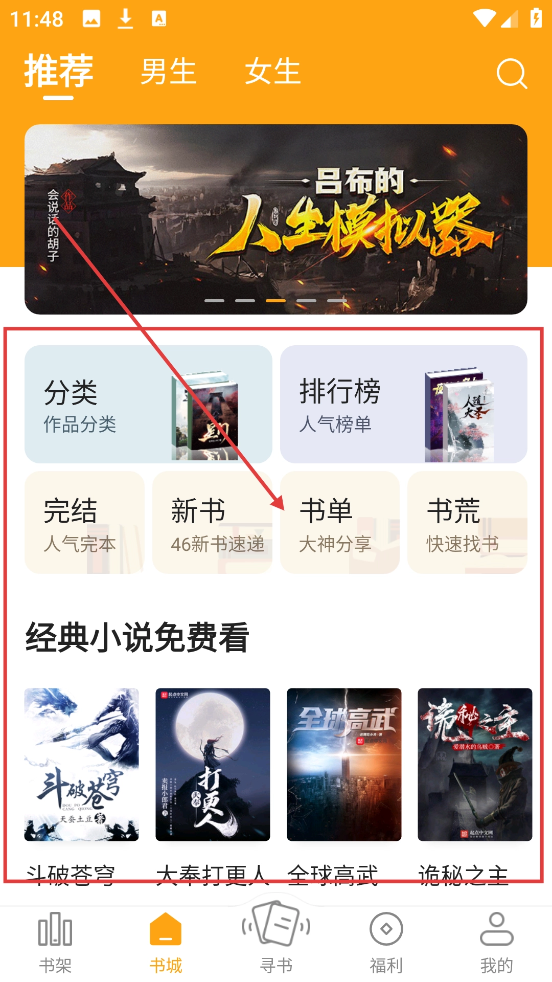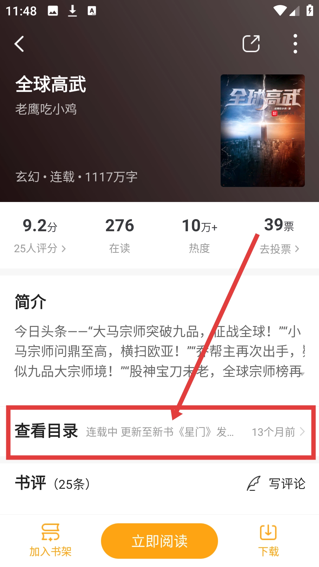 在书城挑选自己感兴趣的小说,比如《全球高武》,然后点击进入小说的详情页面吧。
