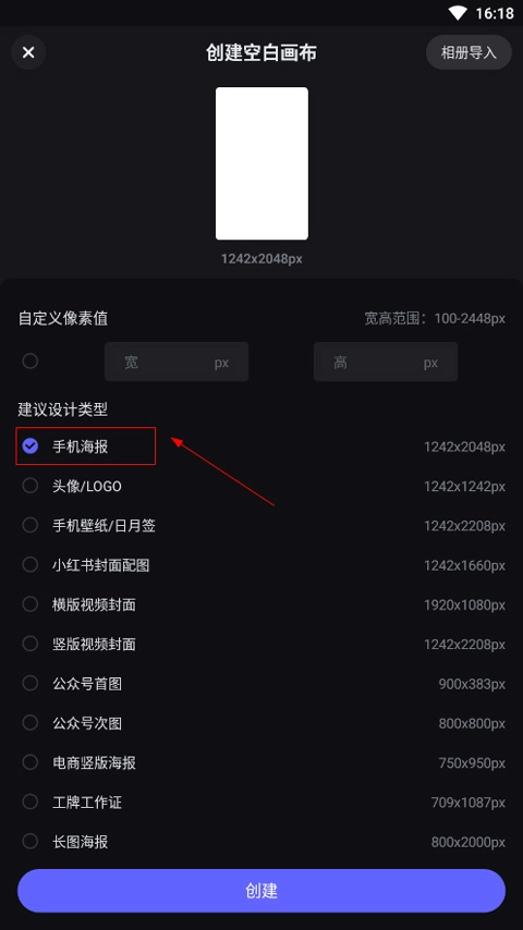 3. 选择需要的像素值和设计类型,然后点击创建。