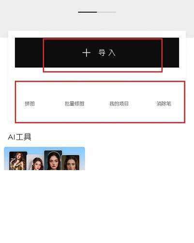 1.hypic打开hypic后,能看到首页的功能布局,点击中间的【拼图】【批量修图】【我的项目】【消除笔】,或者点击【+导入】,都可以进入修图页面。