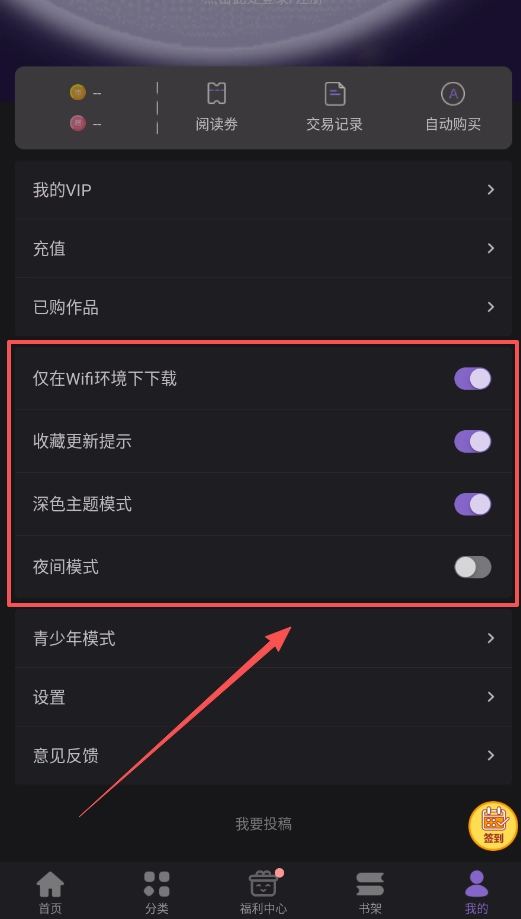 巧妙管理你的账户与阅读设置,在“我的”界面开启“深色主题模式”或“夜间模式”可以保护眼睛。