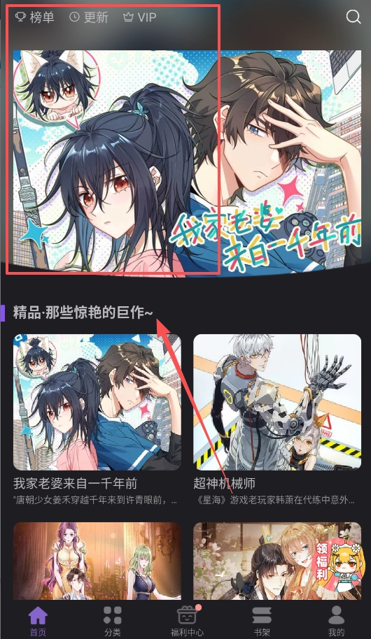 第二步,轻松找到你想看的漫画。首页有精品推荐,要是想自己找书,就去“分类”板块挑选标签,像热血或者恋爱这类都可以。
