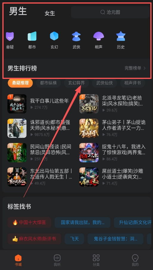 首先,打开软件后,在底部导航栏找到“书城”选项,这里能看到“男生”“女生”“热门分类”等入口。