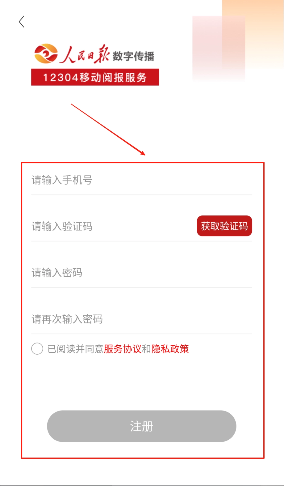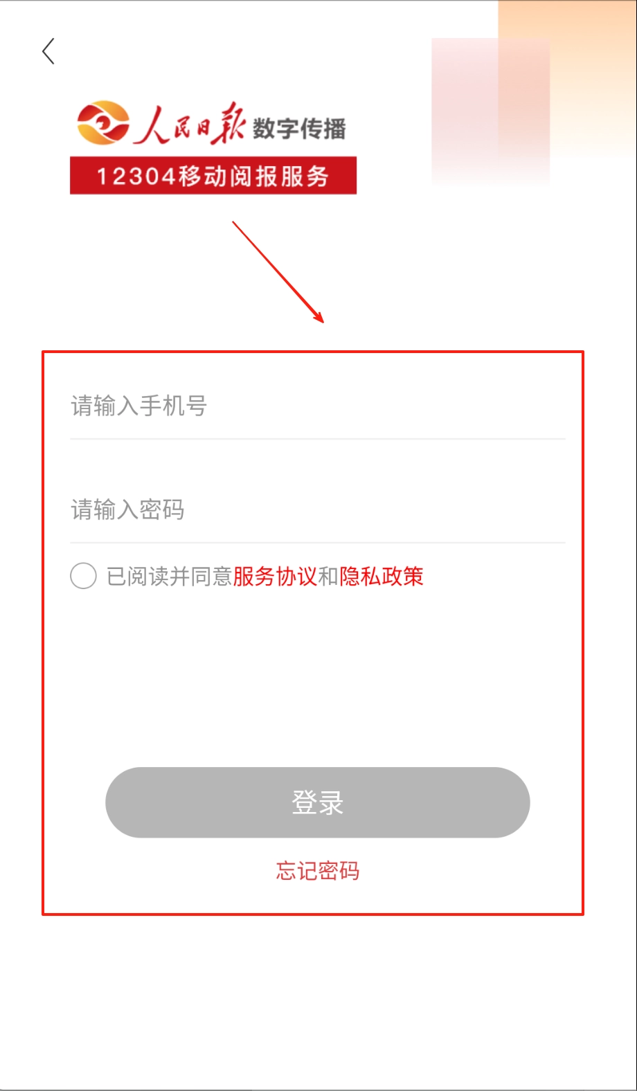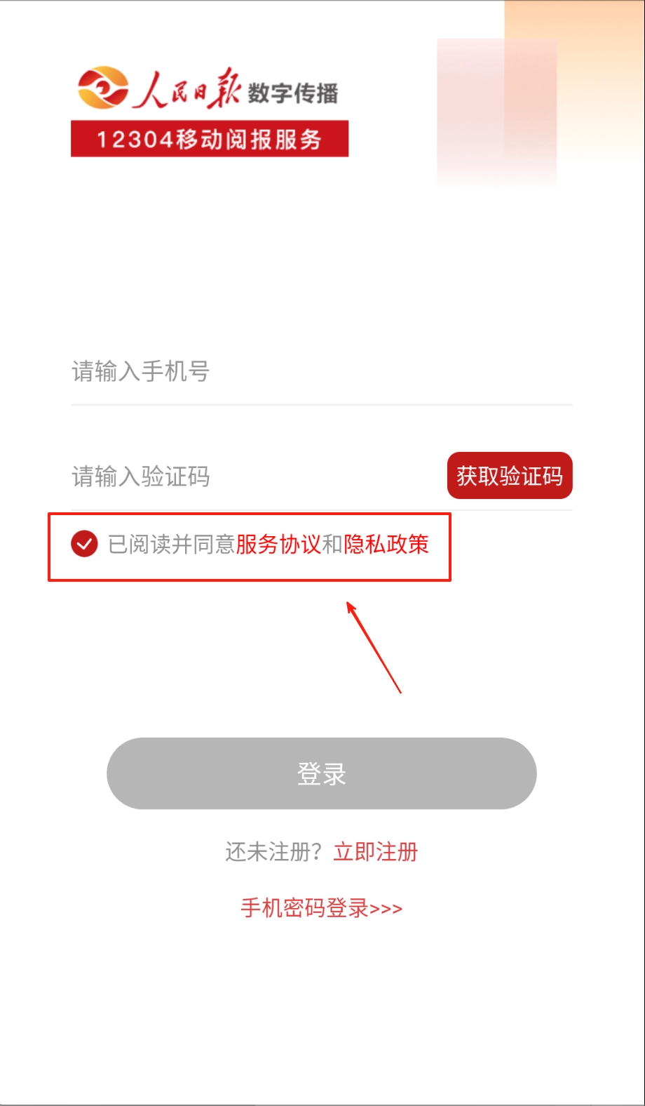 打开人民日报12304应用,进入登录页面后,红色标志和手机号输入框便会映入眼帘,接下来请填写您的注册手机号,准备开启后续操作。