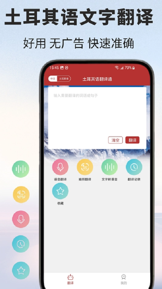 土耳其语翻译通是一款相当专业的手机翻译应用,具备文字翻译、拍照翻译、语音翻译、人工翻译等多种翻译功能,能够满足不同场景的翻译需要,帮助用户实现高效沟通。此外,它还提供土耳其语学习服务,用户可以学习基础字母、单词以及日常对话,同时满足翻译和语言学习两方面的需求。