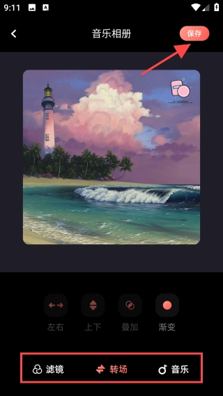 添加滤镜、转场和音乐,预览后【保存】即可。