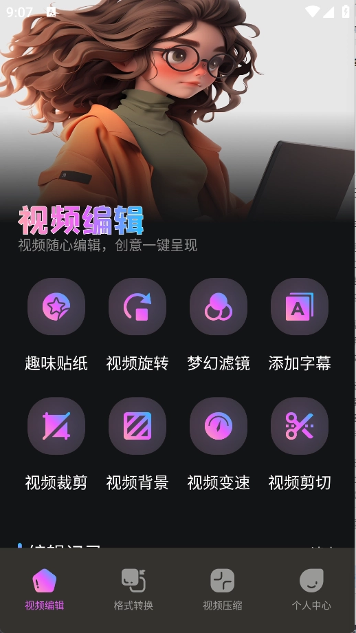 在视频编辑界面里,你可以找到趣味贴纸、视频旋转、梦幻滤镜、添加字幕、视频裁剪等实用功能。