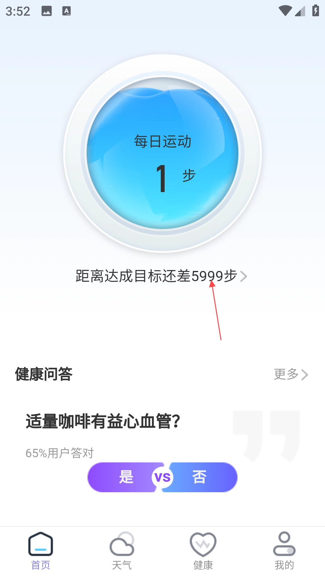 进入首页后,点击显示“距离达成目标还差5999步”的图标。