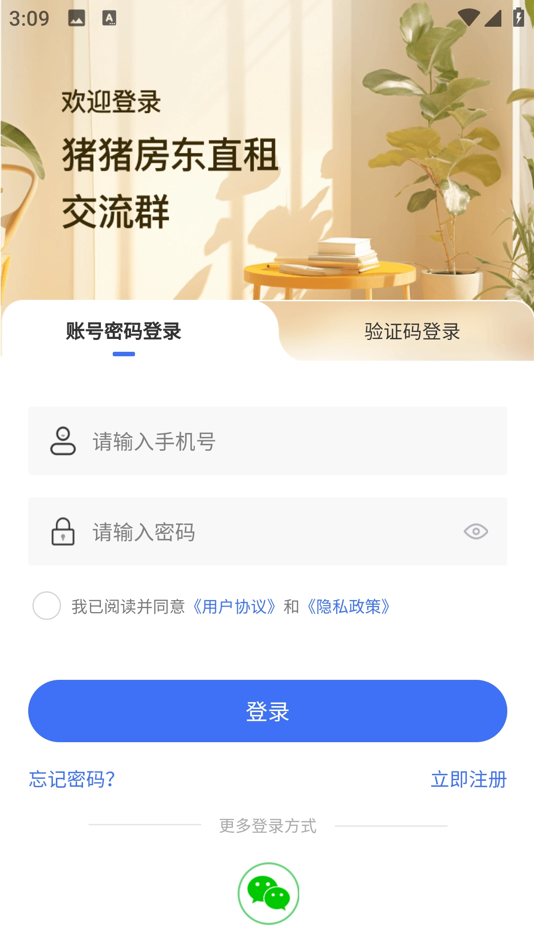 您可以通过输入手机号与密码完成登录,此外也能选择验证码登录方式,或者通过微信跳转直接登录。