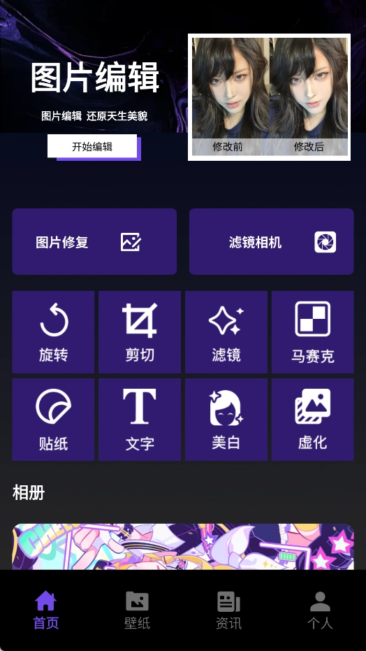 1、首页设有图片修复、滤镜相机、旋转、裁剪、滤镜、马赛克等功能;
