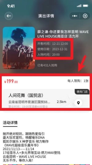 4、进入演出详情页可查看时间、地点、价格等信息,点击下方门店信息了解使用场地及购票入口。