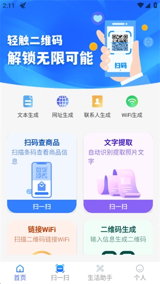 它集二维码扫描、文本/网址/联系人/WiFi二维码生成、商品条码查询、照片文字提取等功能于一身。