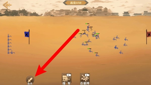 进入战场后,点击“出兵”按钮,迅速安排士兵布好阵型,准备迎击敌人。