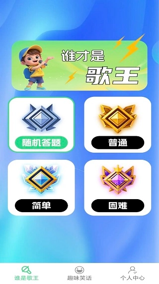 进入安装后的“谁是歌王”页面,会展示随机答题功能,同时提供普通、简单、困难三种关卡选择。