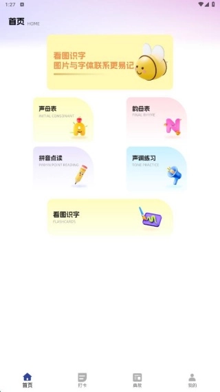 首页包含声母表、韵母表、拼音点读、声调练习、看图识字等学习板块,可免费进入。