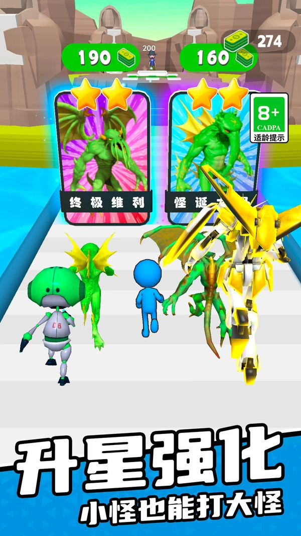 2.在跑道中左右滑动控制角色移动,灵活躲避障碍并收集金钱强化己方卡牌。