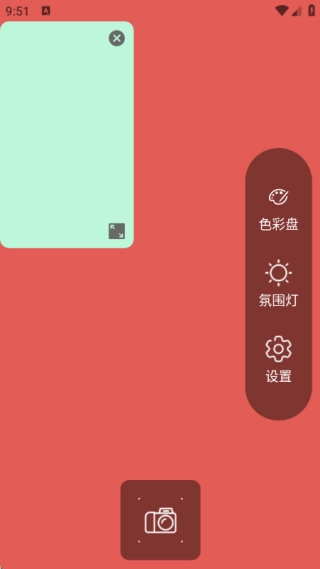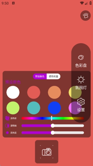 打开软件就能了解色彩盘、氛围灯以及各项设置等内容,并且可以随时进行拍摄操作。