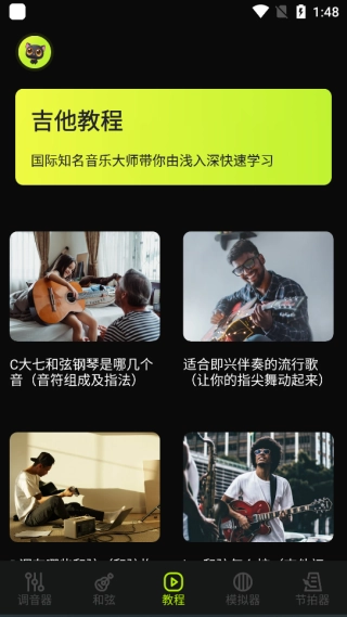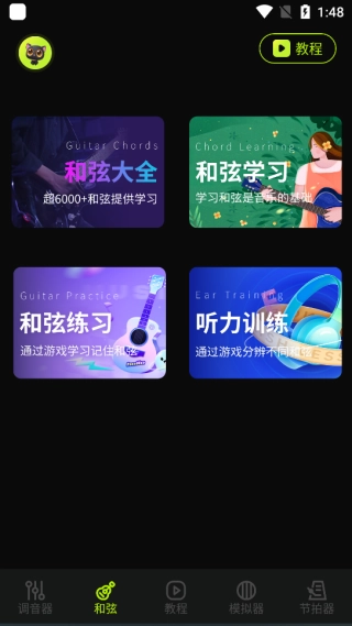 交互式学习模块包含和弦库、音阶库等资源,用户能借助与吉他和弦及音阶的互动操作,有效提升自身的演奏水平。