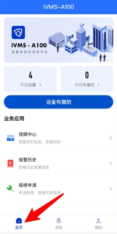 3.点击底部“首页”标签可随时返回主界面,快速访问布撤防、视频查看、报警与报修相关功能。