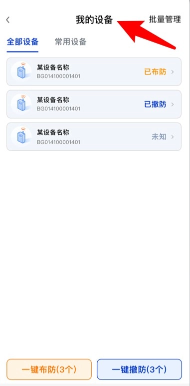 4.进入“我的设备”界面可查看所有设备的布防状态,并可通过一键操作实现批量布防或撤防。