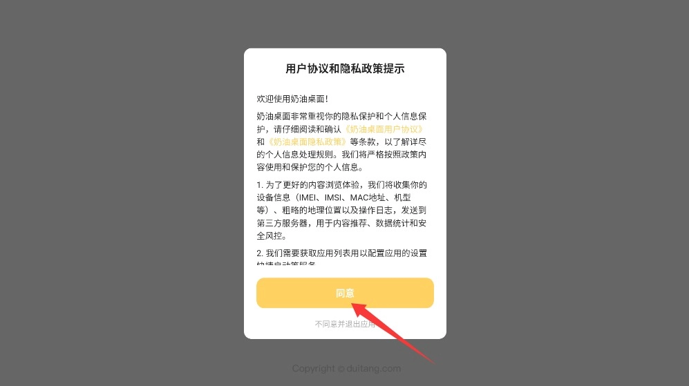 1、初次使用需完整阅读平台服务条款与隐私政策,确认后点击同意按钮进入应用。