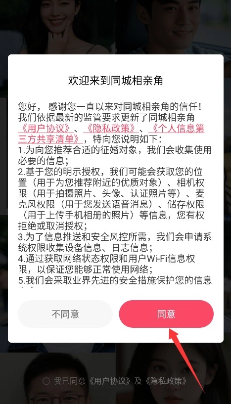 1、首次使用前请仔细阅读平台的服务条款和隐私政策,确认无误后点击同意按钮即可进入应用。