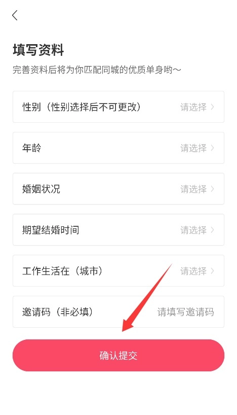 3、填写资料时,依次选择性别、年龄、婚姻状况、期望结婚时间以及工作生活所在的城市,确认无误后点击提交。