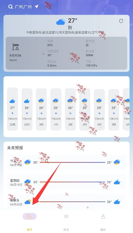 1、视觉设计别出心裁,每日会依据当下天气自动切换对应的花卉主题背景,比如晴天时呈现向日葵、雨天则搭配紫阳花,以此打造出沉浸式的气象感受。