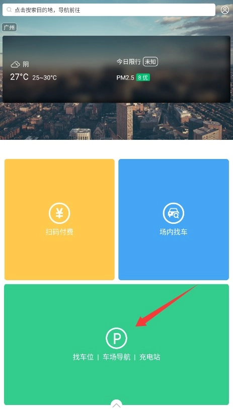2、进入主界面后,可根据自身需求,选择“找车位”“车场导航”或“充电站”功能区域进入使用。