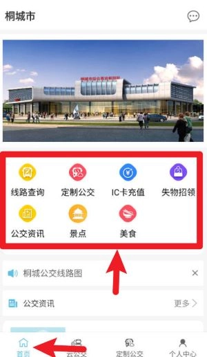 2、登录成功进入首页后,可根据自身需求点击线路查询、IC卡充值等常用功能选项。