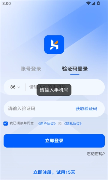 2、在弹出的界面中选择手机号登录方式,随后获取验证码,输入验证码并点击登录按钮,即可进入软件。