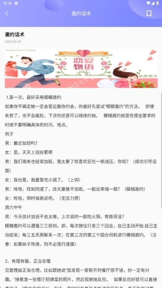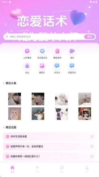 首页呈现了多样的话术内容,涵盖邀约、搭讪等不同类别,同时支持查看情侣头像,获取趣味话题。