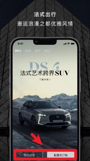 1、点击首页的“预约试驾”或“配置和订购”按钮,就能开启DS 4法式跨界SUV的定制之旅。